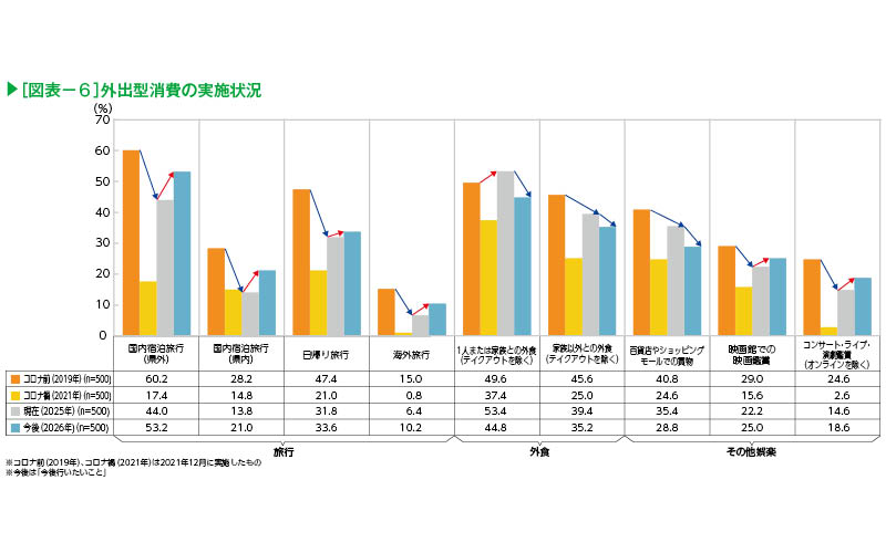 コロナ禍で激減した外出型消費をみると、足もとではコロナ時から全体的に回復しているが、「1人または家族との外食」を除きコロナ前の水準を上回るには至っていない(図表-6)。今後の消費意向では、「旅行」や「映画鑑賞」「コンサート・ライブ・演劇鑑賞」は足もとを上回るものの、「外食」や「百貨店やショッピングモールでの買物」は下回っている。