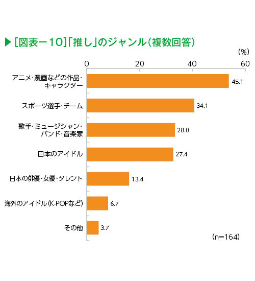 推し」のジャンルでは、「アニメ・漫画などの作品・キャラクター」(45.1%)が最も多く、次いで「スポーツ選手・チーム」(34.1%)、「歌手・ミュージシャン・バンド・音楽家」(28.0%)、「日本のアイドル」(27.4%)となった(図表-10)。