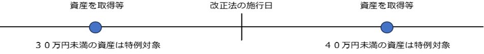 改正法が令和8年4月1日に施行した場合には、令和8年3月31日までに取得等した資産に30万円未満の現行要件が適用され、同年4月1日以後に取得等する資産については40万円未満であれば本特例の対象となる予定です。