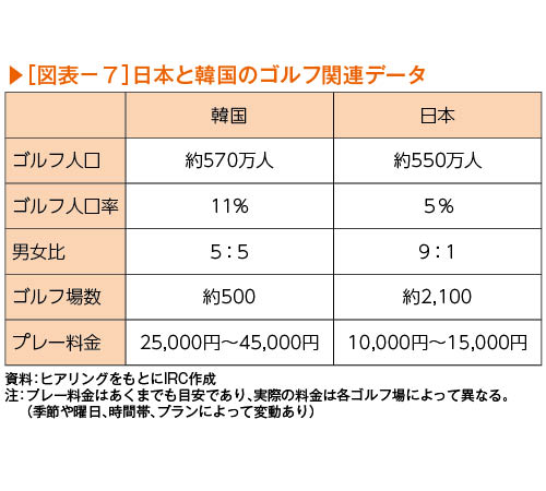 韓国ゴルフブームの火付け役は、1998年に全米女子オープンで優勝した朴(パク)セリと言われている。子どもの習い事の一つとしても人気があり、若年層や女性のプレイヤーも多いのが特徴である。また、新型コロナ発生後、密を回避するスポーツとしてさらに需要が高まり、爆発的な人気へとつながった。韓国の人口は日本の半分以下であるが、ゴルフ人口は約570万人と日本を上回っている(図表-7)。一方で、ゴルフ場は、日本の1/4の500程しかなく、需給ひっ迫によりプレー代金が高騰。日本が10,000円~15,000円に対して、韓国では2~3倍の25,000円~45,000円と大きな差がみられる。