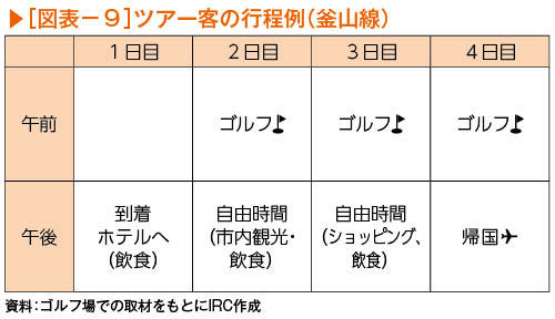 ゴルフツアーを予約して釜山から訪れた男性ゴルファーに取材したところ「3泊4日」「3日間ゴルフ」であった(図表-9)。釜山線の場合、到着が午後5時40分のため、到着日はツアーバスで松山市内のホテルに向かい、滞在2日目から4日目までの3日間ゴルフを楽しんでいた。最終日はゴルフを楽しんだ後、ゴルフ場から直接空港に向かっていた。