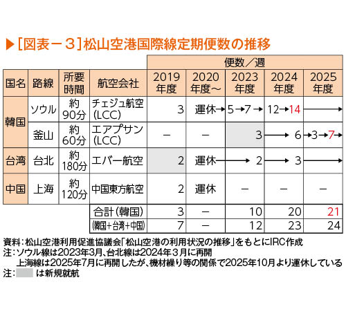 韓国人が増えた大きな理由として「直行便の増加」が挙げられる。松山空港の韓国線直行便は、2019年当初はソウル線のみの週3便であったが、2023年以降、釜山線の新規就航やソウル線の増便により、現在ではソウル線が週14便、釜山線が週7便の計21便と過去最高となった(図表-3)。四国における韓国線の便数は松山空港が高松空港を抑え最多である。
