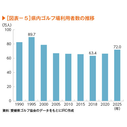 愛媛県ゴルフ協会によると、協会加盟の19ゴルフ場における延べ利用者は、1995年の89万人をピークに2018年まで減少が続き63万人まで落ち込んだ(図表-5)。コロナ禍を経て増加に転じたものの、人口減少を背景に国内ゴルファーの緩やかな減少は避けられない状況にある。