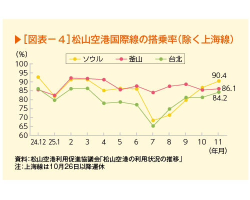2025年の各路線の搭乗率は、7月に地震の予言が広がり、ソウル線・台北線で一時的に落ち込んだものの、直近はいずれも9割前後と高水準となっている(図表-4)。