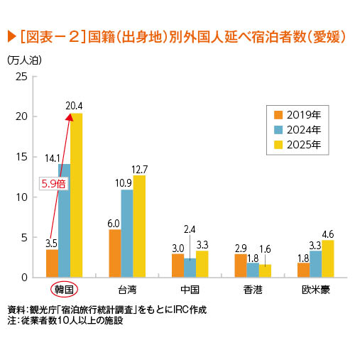 愛媛の2024年外国人延べ宿泊者数は23年から約2.2倍の45万2千人泊となり、伸び率は全国トップだった(図表-1)。2025年(速報値)は更に伸びて前年比約1.3倍の58万人泊となり、インバウンドの増加の勢いは続いている。国籍(出身地)別の内訳をみると2019年と比較して韓国と台湾が大幅に増加している(図表-2)。特に韓国の伸びは顕著で5.9倍の20万4千人泊となった。2019年の外国人延べ宿泊者数はトップが台湾(29%)、次いで韓国(17%)であったが、2024年に逆転し、2025年は韓国43%、台湾27%、中国7%となった。