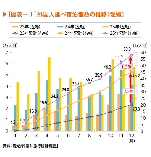 1.愛媛の2024年外国人延べ宿泊者数は23年から約2.2倍の45万2千人泊と、伸び率は全国トップ。2025年(速報値)はさらに伸びて前年比約1.3倍の58万人泊となり、インバウンドの増加の勢いは続いている。国別の内訳をみると、2019年と比較して韓国の伸びが顕著で、5.9倍の20万4千人泊となった。2019年当初はソウル線のみの週3便であったが、23年以降、釜山線の新規就航やソウル線の増便により、現在はソウル線が週14便、釜山線が週7便の計21便と過去最高。