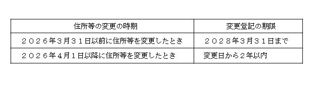 なお、施行日(2026年4月1日)より前に住所等を変更した場合であっても、変更登記をしていない場合には義務化の対象となり、2028年3月31日までに変更登記をする必要があります。