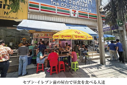オフィス近くのセブン‒イレブンの前にある屋台で食事をしている人達が、セブン‒イレブンを冷蔵庫代わりにして、冷たい飲み物だけを購入する姿も見かけます。