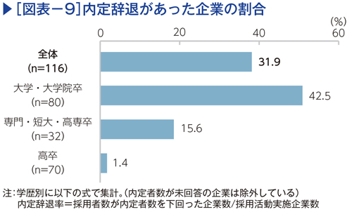企業へのヒアリングで内定辞退を懸念する声が聞かれたため、今回のアンケート結果から内定辞退を推計した(図表−9)。ここでは、内定者数が採用者数を上回っている企業で内定辞退が発生したと仮定し、応募者の学歴別に発生率を計算した。