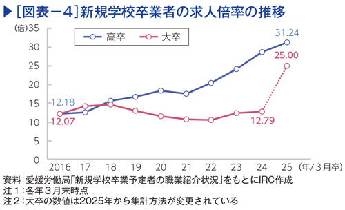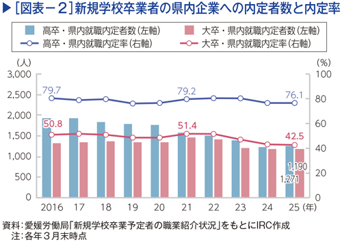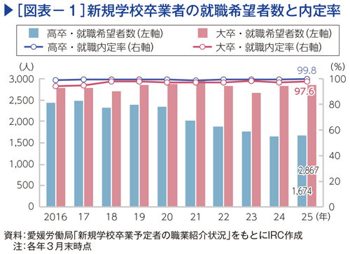 新卒就職希望者は、大部分を大学卒と高校卒が占める。県内における2025年3月末時点の就職希望者数は、大学卒が2,867人、高校卒が1,674人で内定率はいずれも100%に近い(図表−1)。ただし、少子化と大学進学率の上昇を背景に高校卒の就職希望者は減少傾向にある。