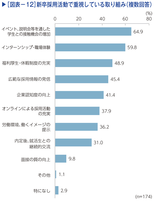 企業が重視している取り組みで最も多かったのは「イベント、説明会等を通した学生との接触機会の増加」(64.9%)で、次いで「インターンシップ・職場体験」(59.8%)となった(図表−12)。大半の企業がイベントや職場体験での接触機会を重視していることが分かるが、「面接の質の向上」や「内定後のフォロー」などの優先度は低くなっている。