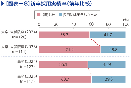 採用実績では、大学卒で71.2%、高校卒で60.7%が採用に至っている(図表−8)。新卒を採用した企業の割合を昨年と比較すると、大学卒、高校卒ともに増加している。これは新卒採用実績が堅調に推移していることを示している。