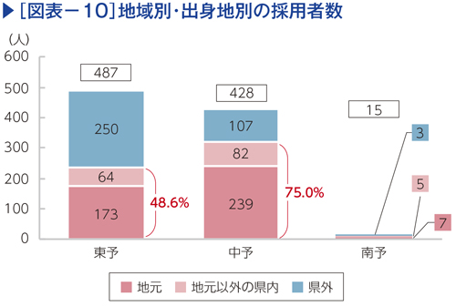 次に、東中南予別に企業の本社所在地と新卒者の出身地域の関係をまとめた(図表−10)。