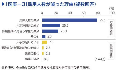 昨年のIRCの調査では、県内企業で新卒採用人数が減った理由は「応募人数の減少」が79.1%で最も多い(図表-3)。採用計画に見合った応募数を確保できていないことが、新卒採用における最大の障壁となっている。