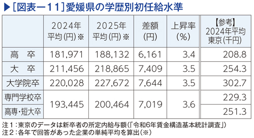 初任給の支給額を学歴別にみると、いずれも昨春から約3.5%程度の上昇がみられる(図表−11)。東京と比べると低いものの、県内企業において初任給の改定が進んでいる状況が分かる。