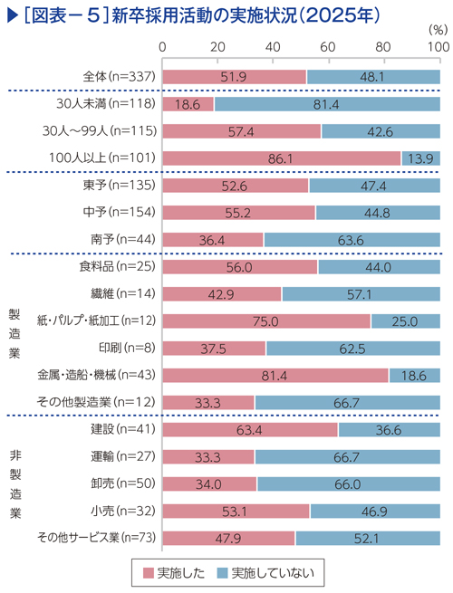 県内企業で新卒採用活動を「実施した」と回答した割合は51.9%となった(図表−5)。地域別では、東予や中予では半数以上の企業が実施した一方で、南予では36.4%と半数を割っている。従業員規模別では100人以上で86.1%、30人~99人では57.4%、30人未満では18.6%となり、従業員規模が小さいほど新卒採用離れが進んでいる。業種別では「金属・造船・機械」「紙・パルプ・紙加工」の割合が高い。