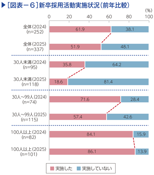 昨年と比較すると、全体では採用活動の実施が10ポイント低下している。また、従業員規模別では、100人以上で増加しているものの、30人~99人、30人未満では低下がみられる(図表−6)。