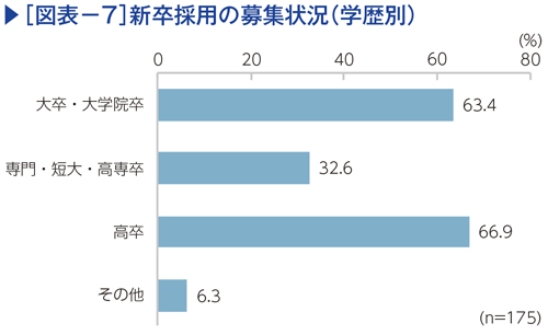 新卒採用を実施した企業の募集状況を学歴別にみると、大学卒(大学院卒含む)が63.4%、高校卒が66.9%を占めている(図表−7)。新卒採用の対象は大学卒と高校卒が中心で、ほぼ同じ割合となっている。
