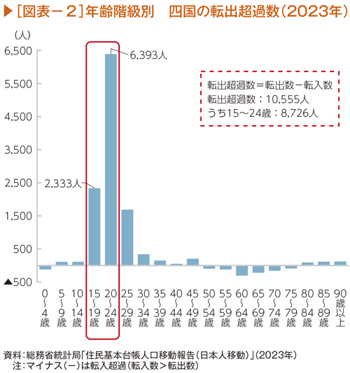 四国における2023年の転入・転出の動きを年齢階級別にみると、転出超過数の約8割(8,726人)を、進学や就職の時期に相当する「15~24歳」の若者が占める(図表-2)。県外への人口流出の主要因は若者の移動であり、進学や就職を機に県外へ出たまま戻って来ない若者の多さが確認された。なお、高校卒業のタイミングである「15~19歳」よりも「20~24歳」で転出超過数が多いのは、住民票を大学進学時ではなく、就職後に異動させるケースがあるためと推測する。