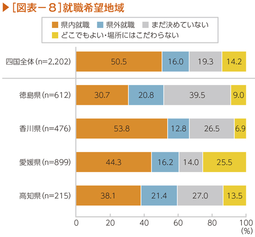 全体の約2割を占める「就職」希望者の就職希望地域をみると、「県内就職」が50.5%、「県外就職」が16.0%となっており、県内での就職を希望する生徒が比較的多い結果となった(図表-8)。県別にみると、立地環境や産業構造の違いから割合に差はあるものの、県外就職より県内就職の方が多いという同じ傾向が確認された。