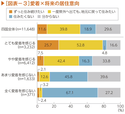 将来の居住意向を尋ねたところ、「ずっと住み続けたい」「一度県外へ出ても、地元に戻って住みたい」が合わせて51.4%と5割を超えている(図表-3)。また、地元に対する愛着度と将来の居住意向の関係をみると、愛着が強いほど、定住志向または回帰志向が高くなる傾向が確認された。