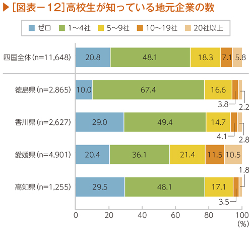 名前だけでも知っている地元企業の数を尋ねたところ、全体では「1~4社」と回答した割合が48.1%と最も高く、次いで「ゼロ」(20.8%)となった。県別では、「ゼロ」と「1~4社」の割合に大きな違いがみられるが、5社以上を知っている生徒が比較的少ない傾向にあることは共通している(図表-12)。