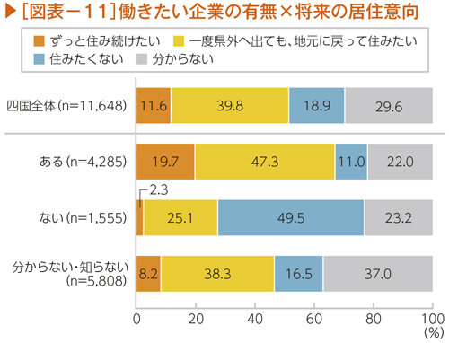 働きたい地元企業の有無と将来の居住意向の関係をみると、働きたい企業が「ある」と回答した生徒は定住または回帰志向を持つ割合が67.0%と高く、「ない」と回答した生徒では約半数が「住みたくない」(49.5%)と考える傾向がみられた(図表-11)。