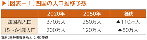 四国の人口は、1985年から2023年までの約40年間でおよそ70万人減少した。今後はさらに加速することが見込まれ、将来推計によると25年後の2050年には2020年比で総人口が約110万人、労働力人口は約80万人減少すると予想されている(図表-1)。
