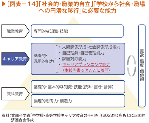 その後、職場体験活動の広がり等により全国に進展していったが、教員一人一人の受け止め方や実践内容・水準にばらつきが生じる等の課題が顕在化したため、2011年に中教審答申「今後の学校におけるキャリア教育・職業教育の在り方について」(以下「キャリア答申」という)が提言された。その中で、キャリア教育は「一人一人の社会的・職業的自立に向け、必要な基盤となる能力や態度を育てることを通して、キャリア発達を促す教育」と新たに定義付けられた。また、同提言の育成対象に掲げられている「基礎的・汎用的能力」とは、「社会的・職業的自立」「学校から社会・職業への円滑な移行」に必要な能力のうち、特にキャリア教育の中で育むべきものと位置付けられており、「人間関係形成・社会関係形成能力」「自己理解・自己管理能力」「課題対応能力」「キャリアプランニング能力」から成るものと定義されている(図表-14)。