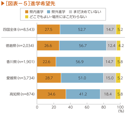 全体の7割を占める進学希望者の進学先では、「県内進学」が27.5%に対し、「県外進学」が52.7%となり、半数以上が県外への進学を希望している(図表-5)。県別にみても、割合に多少の差はあるものの、4県とも県外進学が県内進学を上回っており、同じ傾向が確認された。