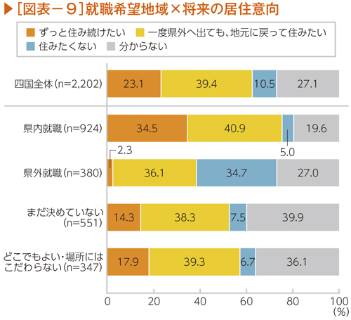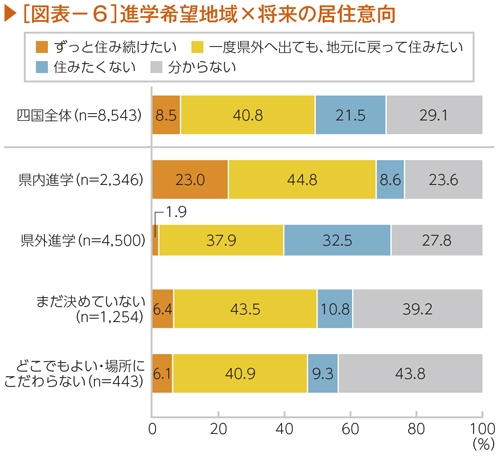 進学希望者に将来の居住意向について尋ねたところ、「ずっと住み続けたい」「一度県外へ出ても、地元に戻って住みたい」と回答した生徒の割合は、全体では49.3%だったのに対し「県内進学」では67.8%にまで高まる(図表-6)。
