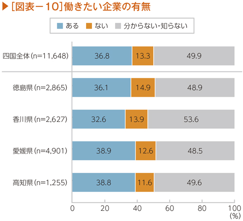 地元に働きたい企業があるかを尋ねたところ、全体では「分からない・知らない」が49.9%と最も高く、次いで「ある」が36.8%、「ない」が13.3%となった(図表-10)。県別にみても、同様の傾向が確認された。