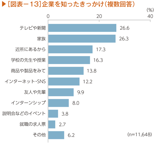 また、企業を知るきっかけについて尋ねたところ、「テレビや新聞」(26.6%)と「家族」(26.3%)が最も多く、次いで「近所にあるから」(17.3%)や「学校の先生や授業」(16.3%)が続く(図表-13)。