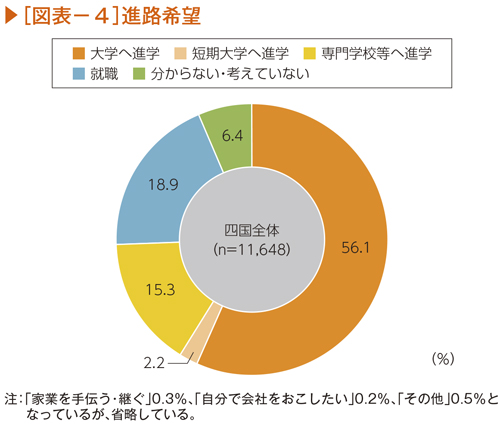 高校卒業後の進路希望は、「大学」「短期大学」「専門学校等」への進学が合わせて73.6%、「就職」が18.9%だった(図表-4)。