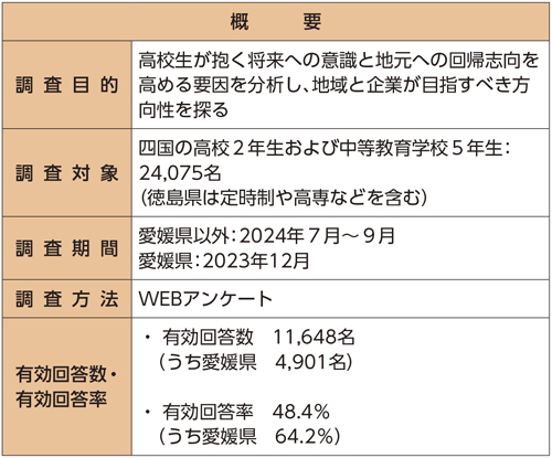少子高齢化に伴う「自然減」と、若者を中心とした転出超過による「社会減」によって、四国の人口減少は急速に進んでいる。更に、将来的な労働力不足も懸念される状況を踏まえると、人口減少が深刻化する地域社会が今後も存続するためには、若者が育った地域に戻って来てくれることが大きな意味を持つ。また人口動態は、多くの若者にとって高校卒業後の進路選択が地元を離れるかどうかを判断する最初の分かれ道となることを示している。そうした進路選択を控えた高校生が、自身の将来をどのように考えているかを知ることは、県外流出を可能な限り抑制するための解決の糸口になるものと考える。