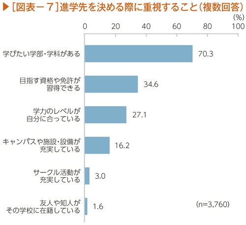 進学先を決める際に重視することを尋ねたところ、「学部・学科」が70.3%と最も多く、「資格や免許」が34.6%で続く(図表-7)。県内進学をしたくても、大学や学部の選択肢が少なく、「県外進学」を選ばざるを得ない状況であることが推測される。