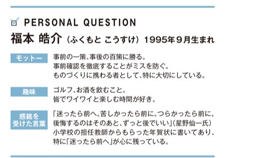 「100年企業を目指している。そのために社員一人ひとりの意識を高めたい」と言う。昨年『総合戦略室』という部署を新設し、30代社員2人と社内の改善活動に取り組んでいる。同室が中心となって関係部署の社員を巻き込みながら、提出書類のフォーマット化、納期管理および工期管理の見える化などを実行した。「さまざまな人が改善活動に関わり、『私たちの会社は私たちが良くしよう』という当事者意識が広がれば、もっと良い会社になる」と、皓介氏。