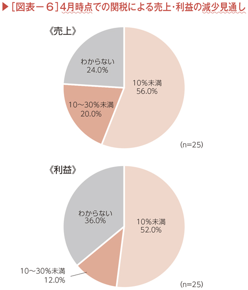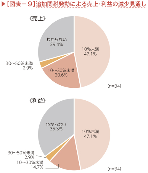 追加相互関税発動によって、売上・利益にどの程度マイナスが予想されるか尋ねたところ、売上は「10%未満」の減少と回答した企業が47.1%と最も多い(図表-9)。「10~30%未満」とした企業は20.6%だが、「足元は数%程度の減収・減益が想定されるが、追加関税が発動されればマイナス幅は大きくなるだろう」という声が複数から聞かれた。