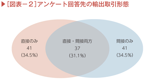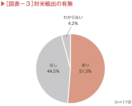 アンケート回答先の輸出取引の形態は、「自社で直接輸出」する企業が34.5%、「商社経由等の間接輸出」も同じく34.5%、「直接・間接の両方」を行っている企業は31.1%だった(図表-2)。また、直接輸出か間接輸出かを問わず、米国向けの輸出がある企業は51.3%だった(図表-3)。