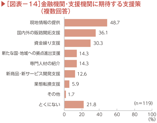 今回のような貿易環境の急激な変化に対応するうえでの問題点や、取引金融機関や支援機関に期待する支援策を尋ねた。問題点で最も回答が多かったのは「現地情報が不十分」で50.4%(図表-13)。それに呼応するように、期待する支援策も「現地情報の提供」が48.7%を占める(図表-14)。報道等でマクロ的な状況はつかめるものの、ミクロの情報が得られない状況に気をもむ企業が多いことがうかがえる。