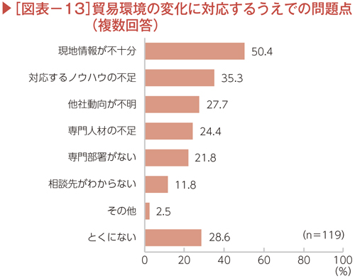 問題点で「現地情報が不十分」に次いで多かったのは「対応するノウハウの不足」で35.3%だった。「専門人材の不足」(24.4%)や「専門部署がない」(21.8%)を含め、自社ですべてを対応するには限界がある。ジェトロ愛媛では、『米国関税措置等に伴う日本企業相談窓口』を、愛媛県でも『金融特別相談窓口』を設置するなどしている。各種支援機関を積極的に活用することを勧める。