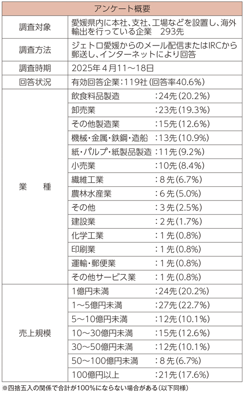 日本は対米輸出依存度が高く、とくに自動車産業に与える影響が大きい。愛媛は全国ほど対米輸出の依存度は高くないものの、地場の主力産業における影響は少なからずあると思われる。このような状況を踏まえ、日本貿易振興機構愛媛貿易情報センター(以下、ジェトロ愛媛という)、および愛媛県産業貿易振興協会(同、産貿協)の協力を得て、県内輸出企業における「トランプ関税」の影響と対応状況を調査した。