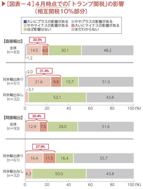 品目別や相互関税の基礎部分10%、中国などへの報復関税が発動されている足元(4月18日時点)での影響を直接輸出・間接輸出別に尋ねた(図表-4)。
