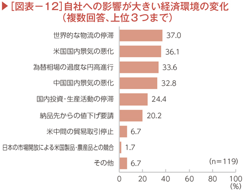 「トランプ関税」からの波及が予想される経済環境の変化のうち、自社の事業にとって影響が大きいものを尋ねた。「世界的な物流の停滞」(37.0%)、「米国国内景気の悪化」(36.1%)がほぼ同数で並び、「為替相場の過度な円高進行」(33.6%)、「中国国内景気の悪化」(32.8%)が続く(図表-12)。これらの状況がさらに顕在化すると、より多くの企業でマイナスの影響が生じてくるだろう。