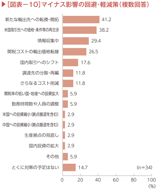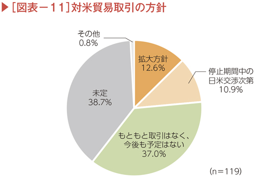 「新たな輸出先への転換・開拓」が41.2%で最多、「米国取引先への価格・条件等の再交渉」の38.2%が続く(図表-10)。取材のなかで「数%程度の値下げは許容できるが、自社製品の付加価値をアピールして極力値下げしないようにする」といった声も聞かれた。