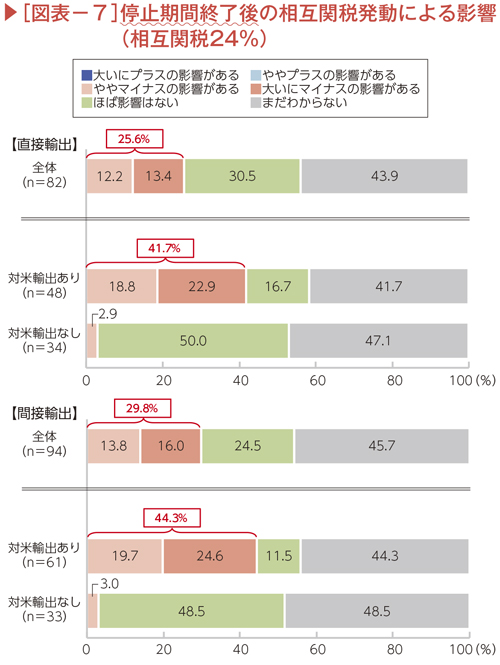 90日間の追加関税停止期間終了後、当初の予定通りに相互関税が計24%となった場合の影響を直接輸出・間接輸出別に尋ねた(図表-7)。