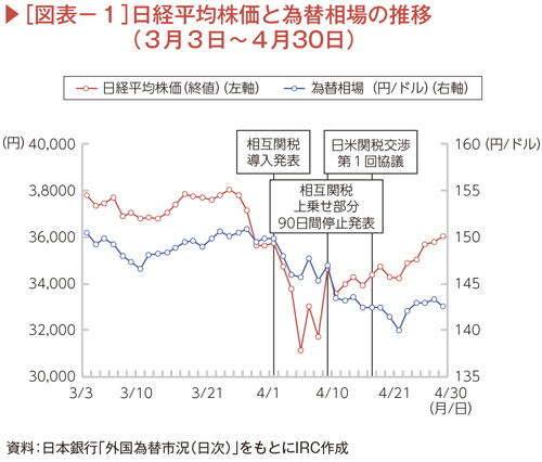 4月2日、トランプ米国大統領による広範な相互関税の発表は、世界経済と金融市場に大きなインパクトをもたらした。相互関税は2層構造になっており、基礎部分の10%は4月5日にほぼすべての貿易相手国・地域を対象に発動された。上乗せ部分は9日に発動されたものの、トランプ大統領は翌10日に上乗せ部分の90日間停止を発表した。2日の発表直後から株式・為替市場が乱高下し、混乱の渦中にある(図表-1)。