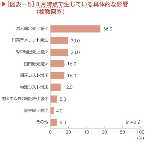 足元(4月18日時点)でマイナスの影響が生じている先に、具体的なマイナスの影響を尋ねた。サンプルが限られているが、「対米輸出売上減少」(56.0%)と回答する割合が最も高かった(図表-5)。そのほかでは、「円高デメリット発生」(20.0%)や「対中輸出売上減少」(20.0%)など、売上に直結する項目への影響が見られる。