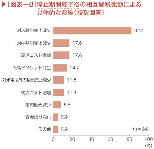 90日後の相互関税発動にともなってマイナスの影響が生じると見込んでいる先に、想定される具体的なマイナスの影響を尋ねたところ、「対米輸出売上減少」(82.4%)と回答する割合が圧倒的に高くなった(図表-8)。足元と比べると「対米輸出売上減少」の割合が26.4ポイント、「対米中以外の輸出売上減少」が3.8ポイント、「資金繰り悪化」が1.9ポイント、「調達コスト増加」が1.6ポイント増加している。相手国に関わらず輸出減少を懸念する企業が多いことがわかる。