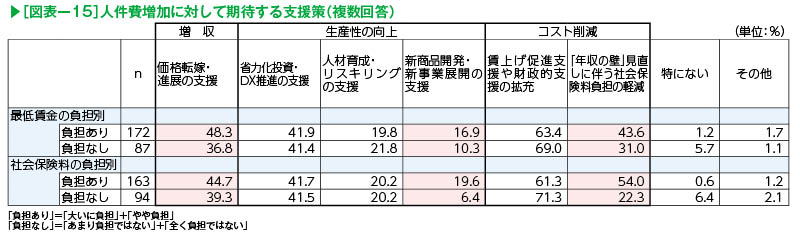負担の有無にかかわらず、「賃上げ促進支援や財政的支援の拡充」が最も高い。また、「負担あり」と回答した企業では、社会保険料の負担軽減と価格転嫁のほか、割合は小さいが生産性の向上のなかでも「新商品開発・新事業展開の支援」が「負担なし」の企業を上回っている。原資確保に加えて、売上増加への効果が高い支援を望む傾向がみられた。